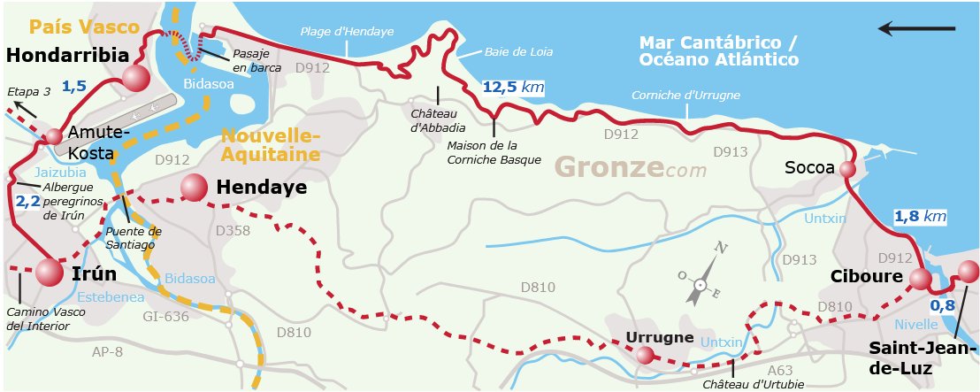 volgt de op deze kaartjes gestippelde routes, dus via Guéthary, Urrugne en Hendaye.